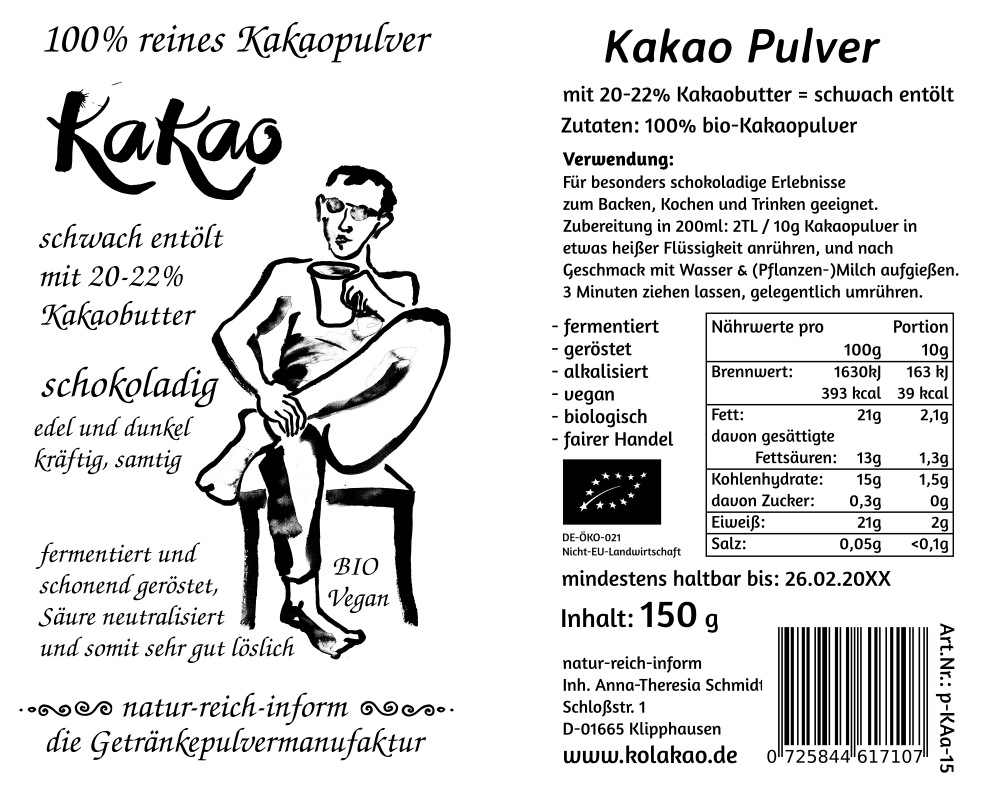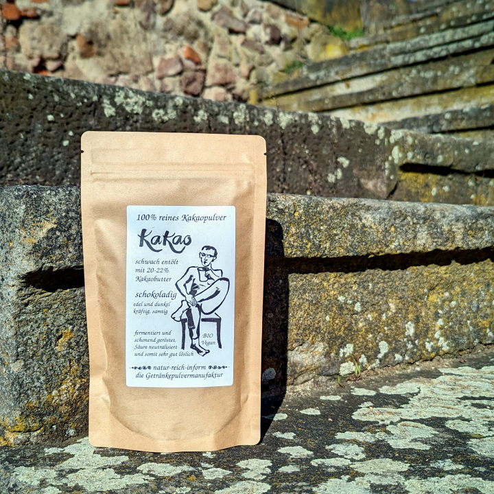 100% bio-Kakaopulver (schwach entölt) mit 20-22% Kakaobutter, alkalisiert