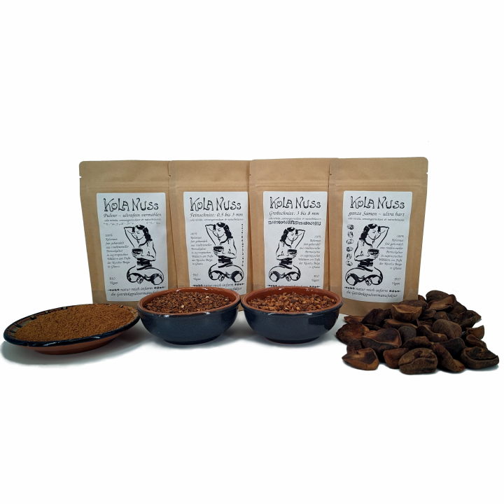 Tipp für Einsteiger: Unser Kennlernpaket enthält vier Varianten: ultrafein vermahlen, fein und grob geschnitten sowie ganze Kolanüsse.